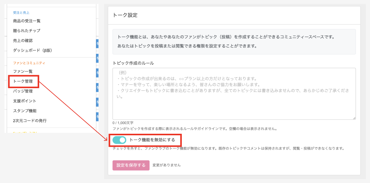 ・デフォルトで機能がONになっておりますので、トークを使用したくない場合はOFFへ変更をお願いします。